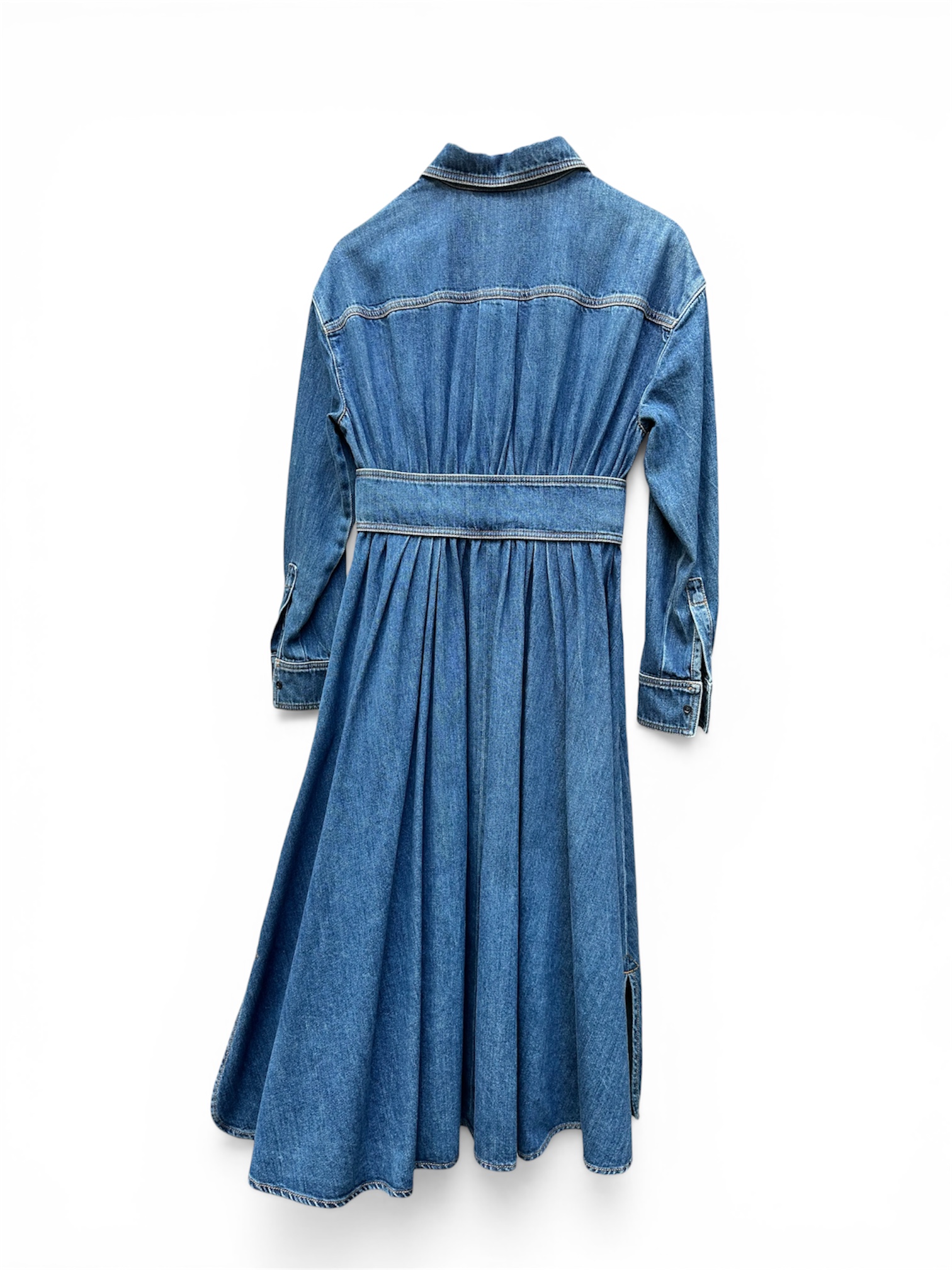 Het is een kuitlange, getailleerde jurk met lange mouwen. De taille meet krap 37cm, dus smal!